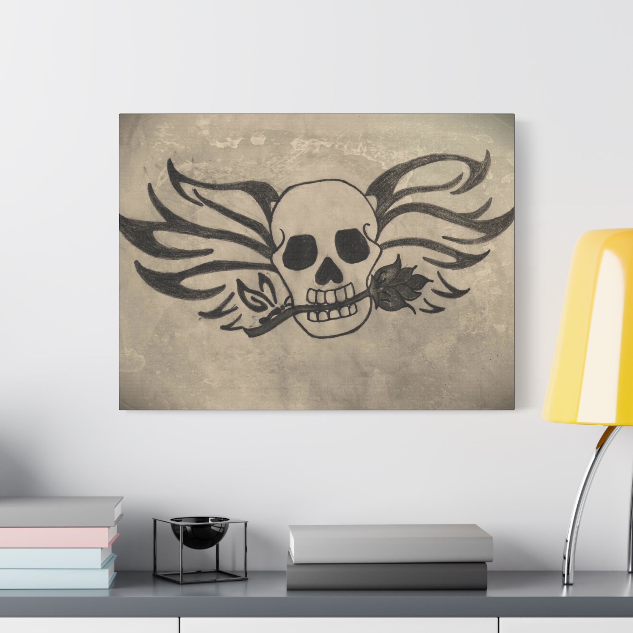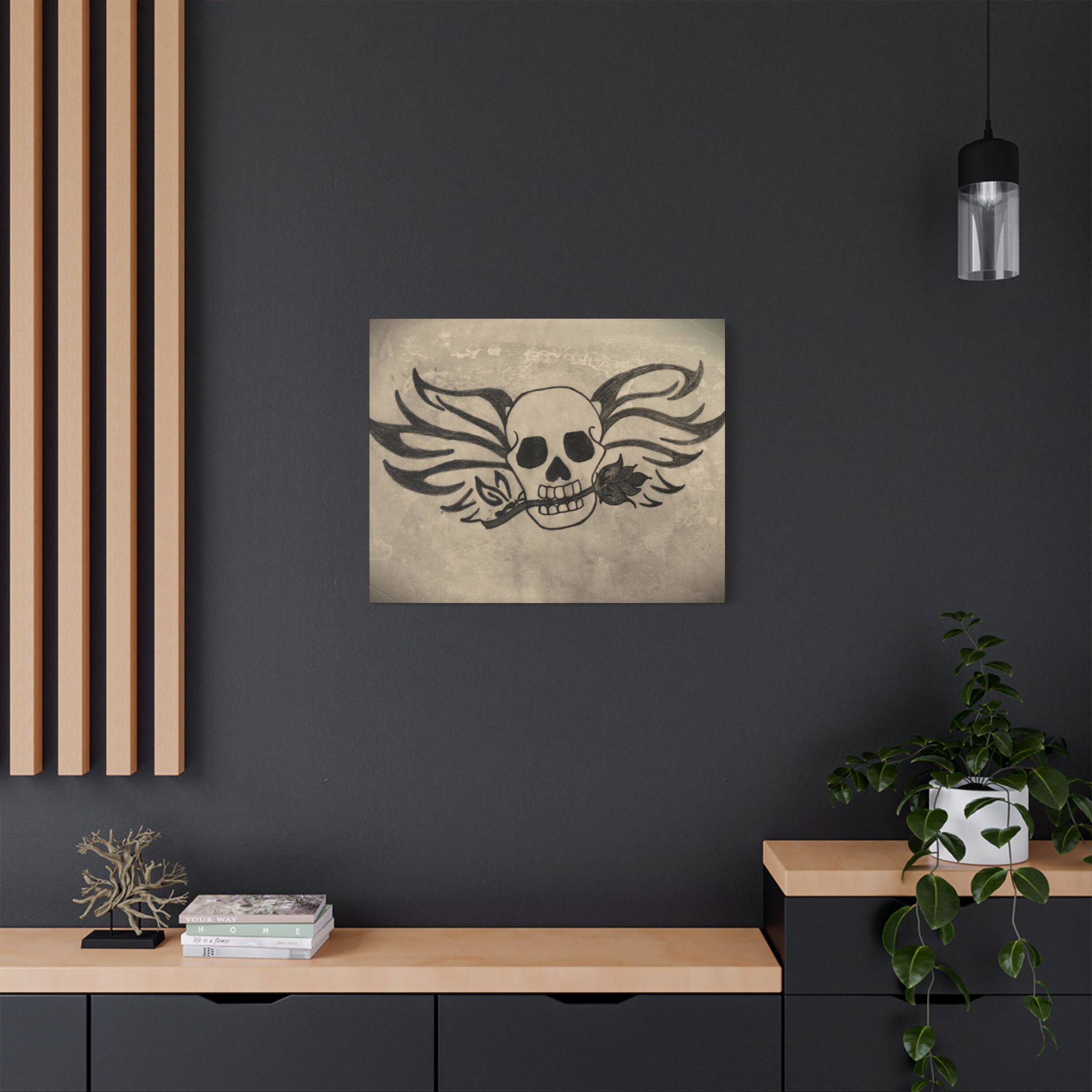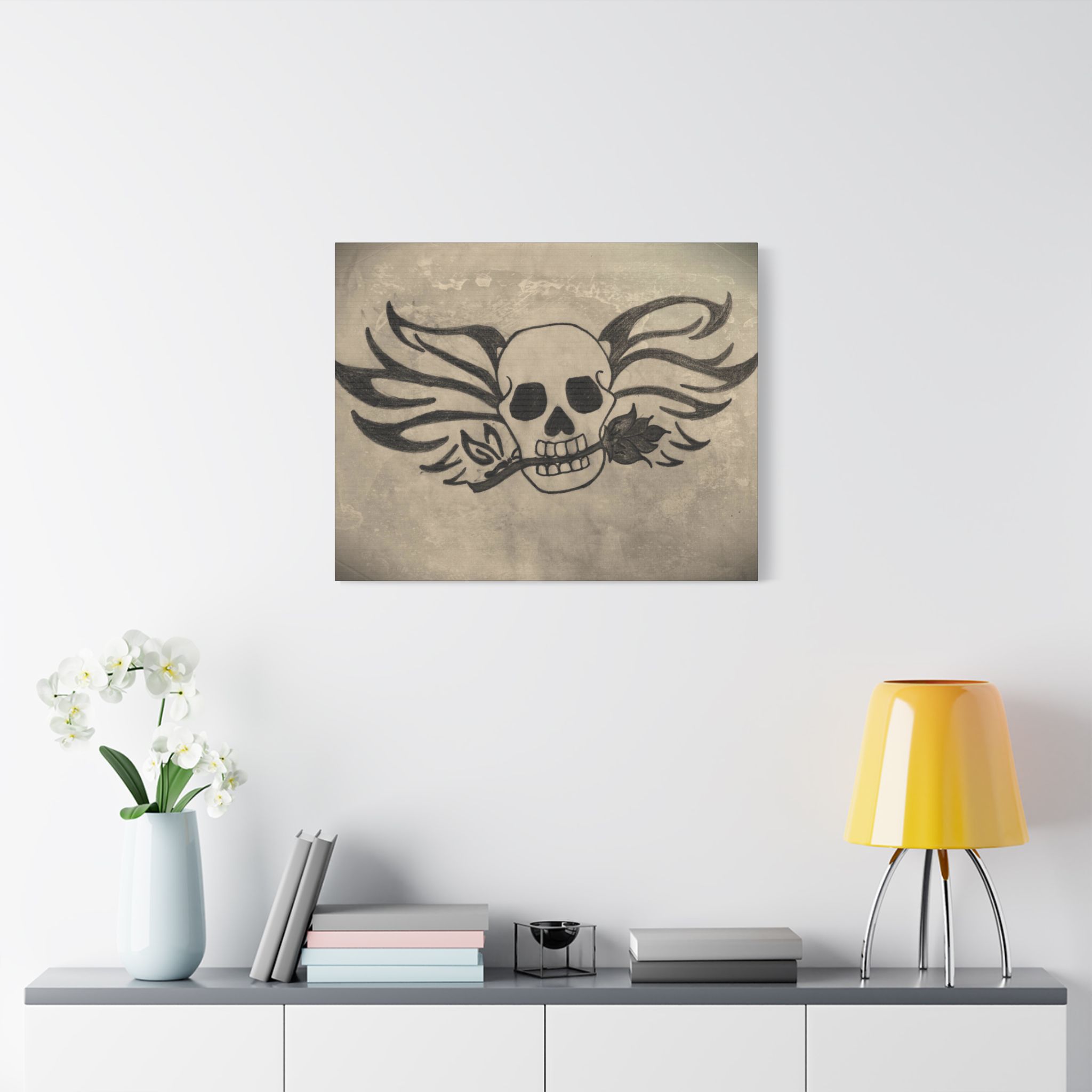 For your convenience, metallic mounts are thoughtfully placed on the back of the canvas, making it effortless to securely hang "Skull and Rose" in your indoor space. Whether it graces the walls of your living room, bedroom, or office, this artwork is bound to captivate and spark conversation.