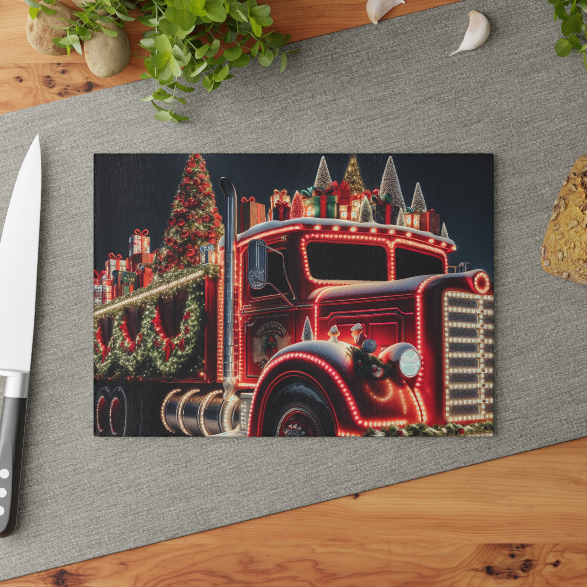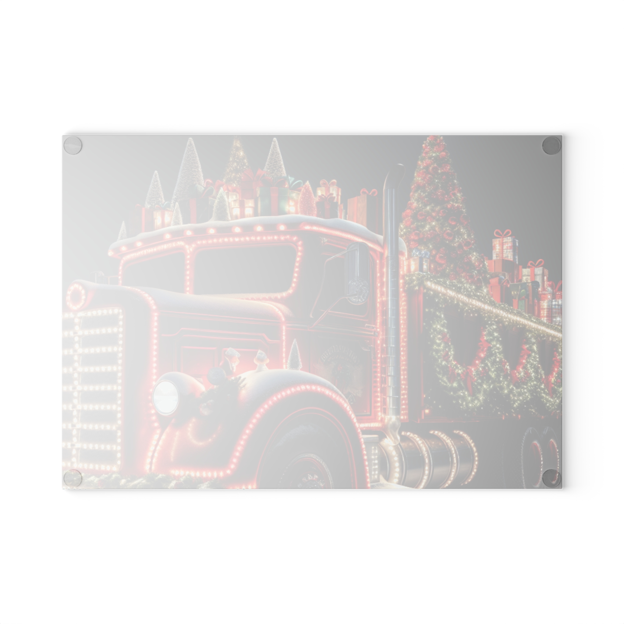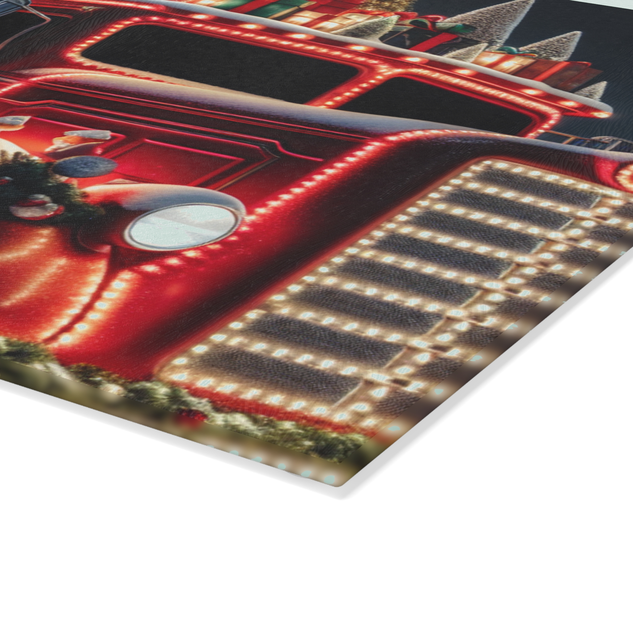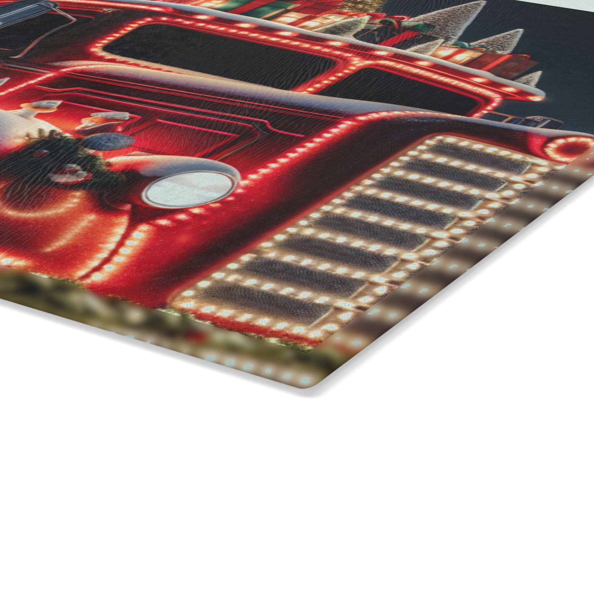 Bring a touch of character into any kitchen with The Christmas Truck glass cutting board.