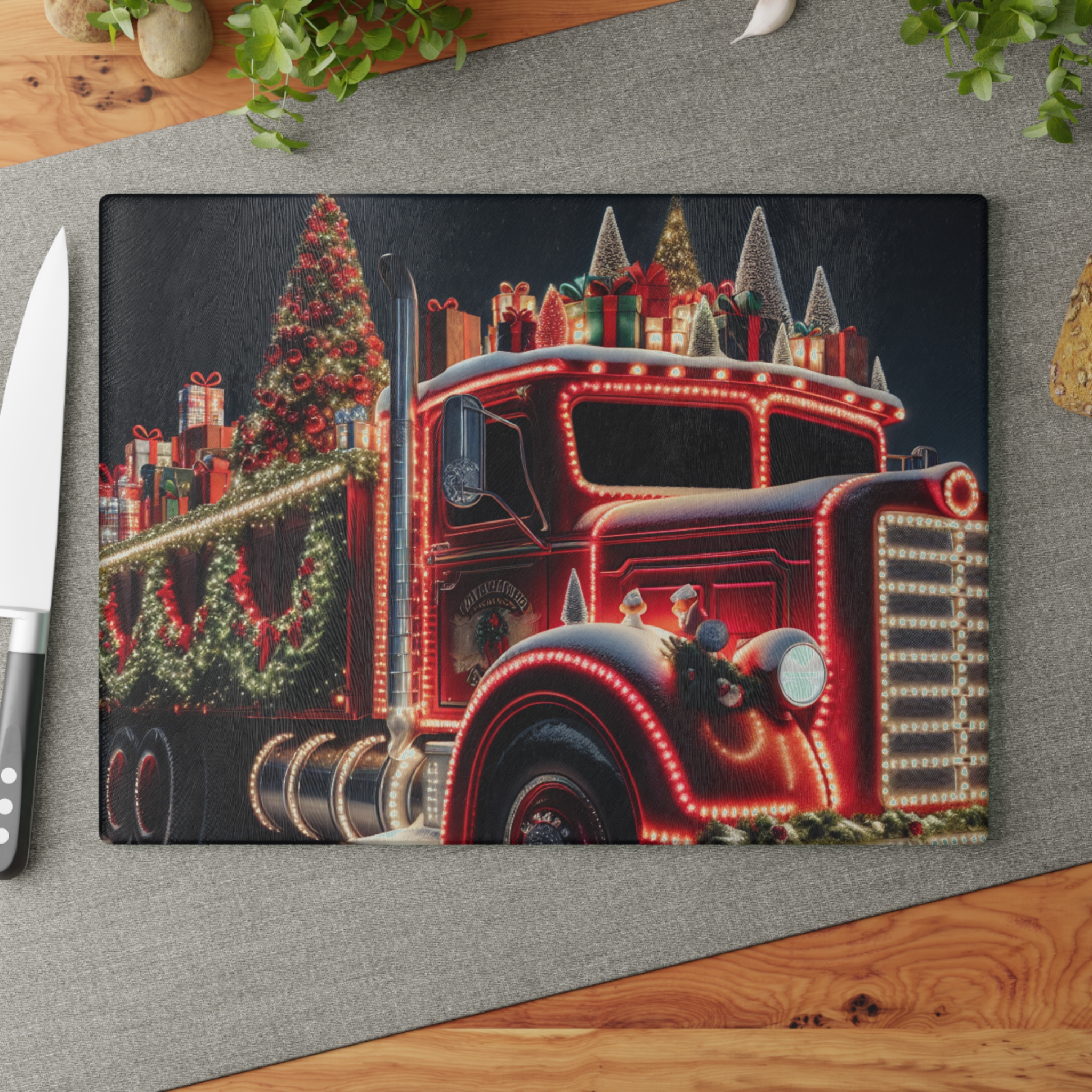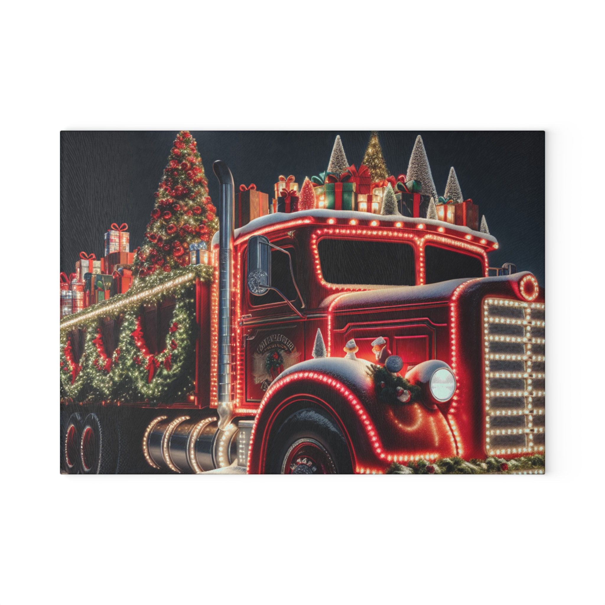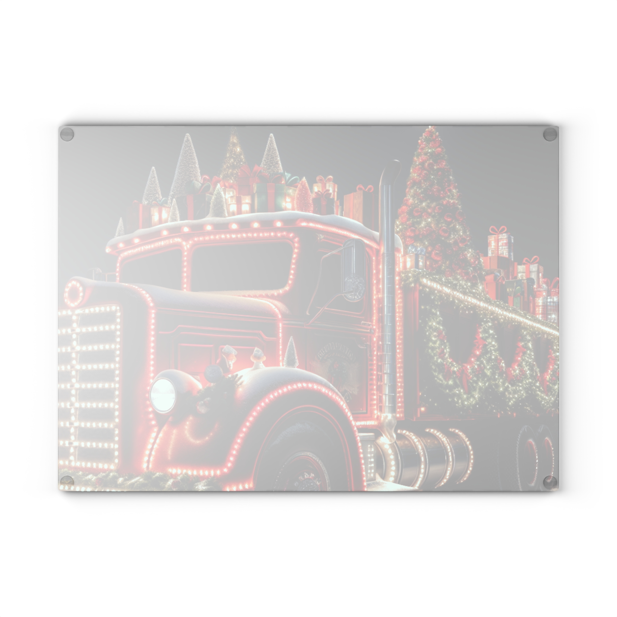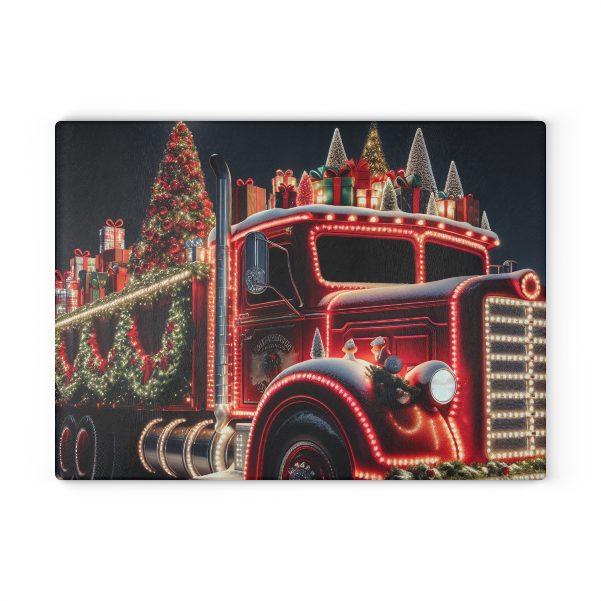Bring a touch of character into any kitchen with The Christmas Truck glass cutting board.