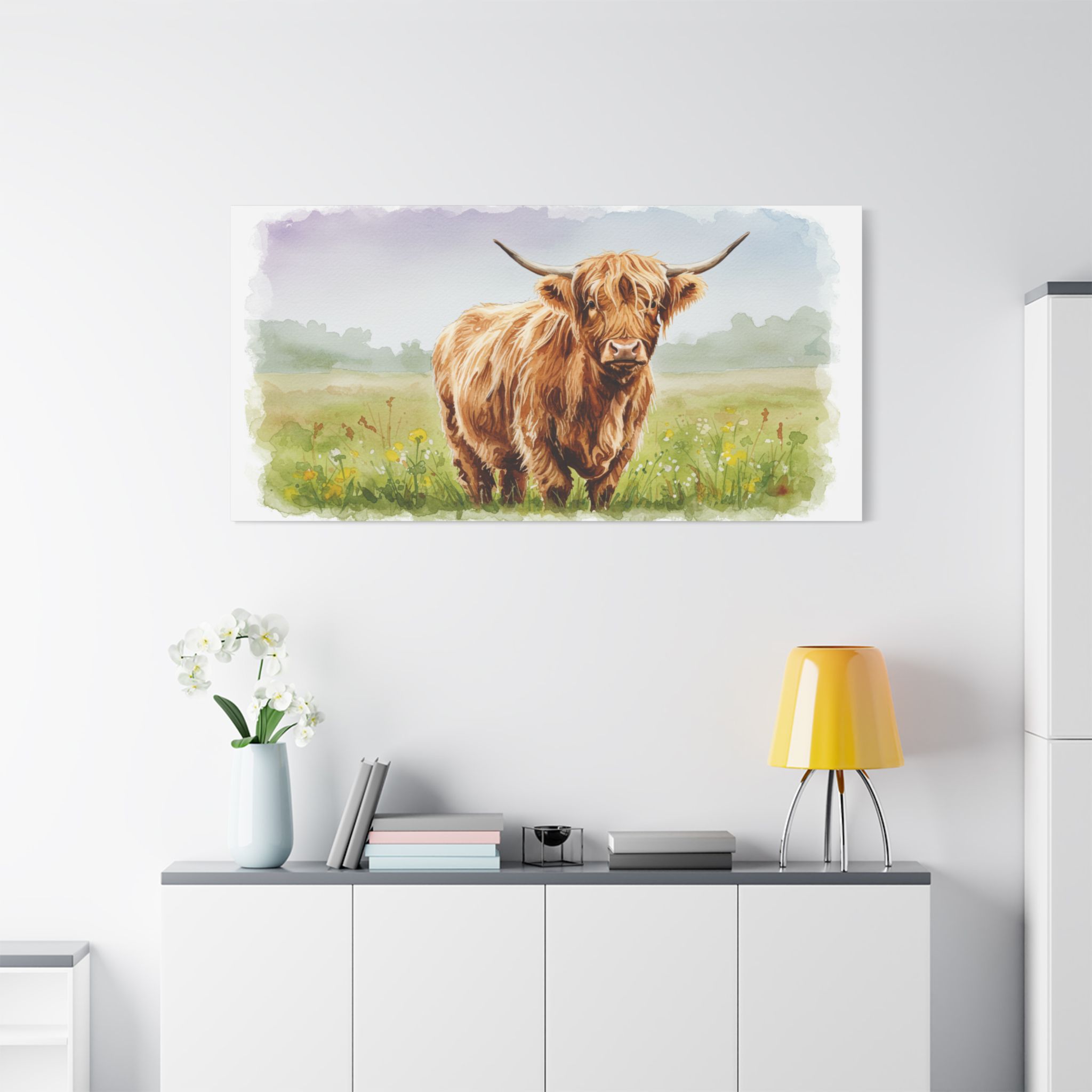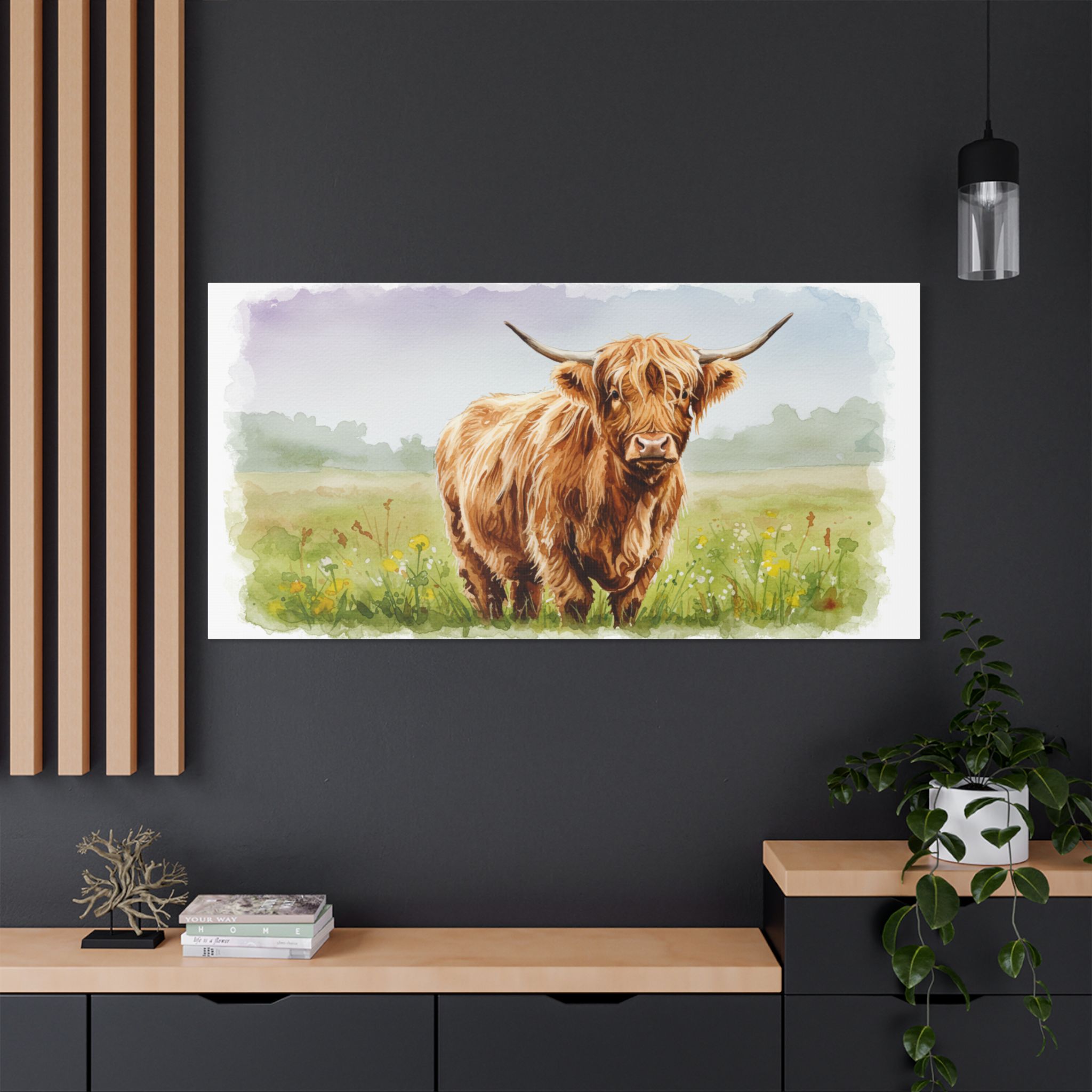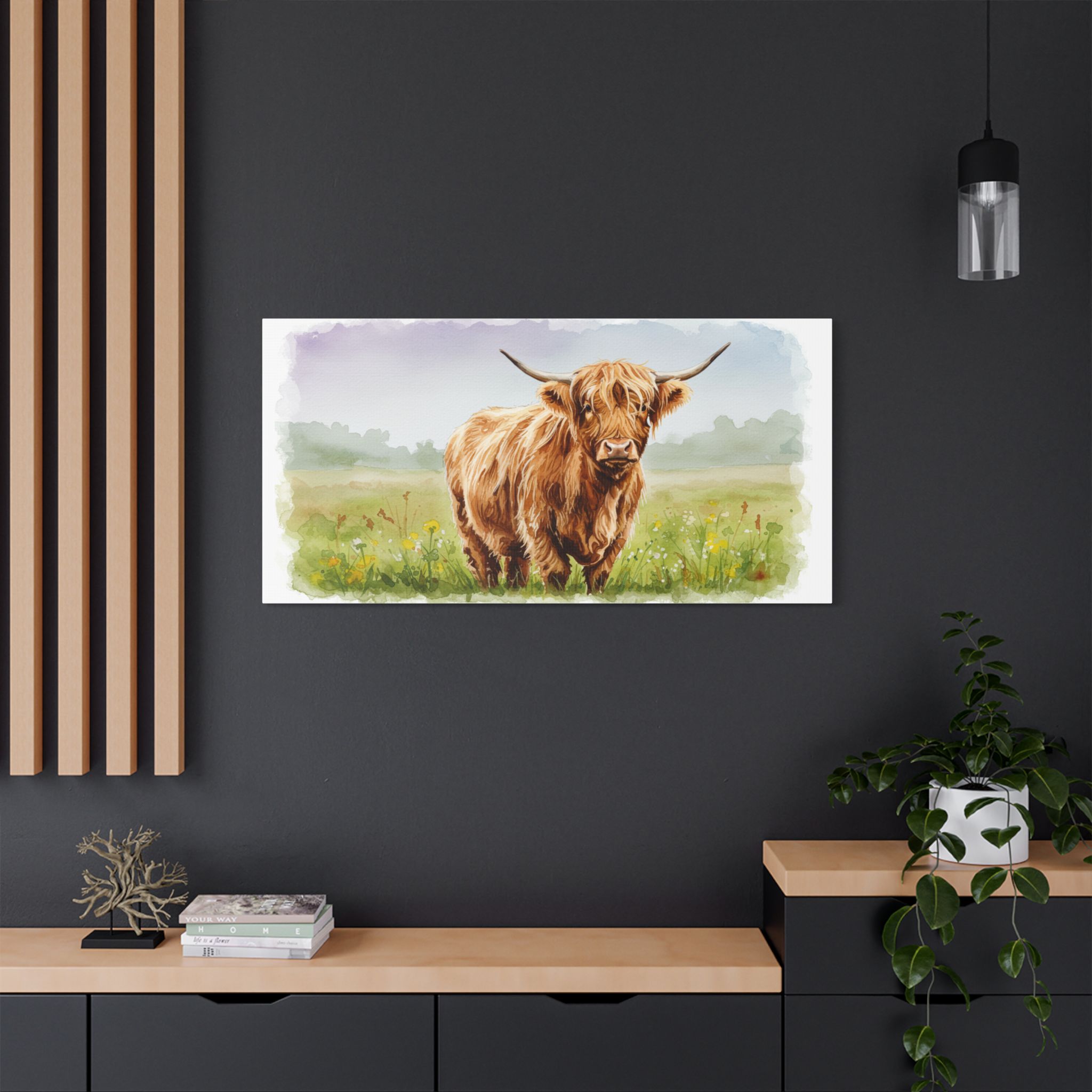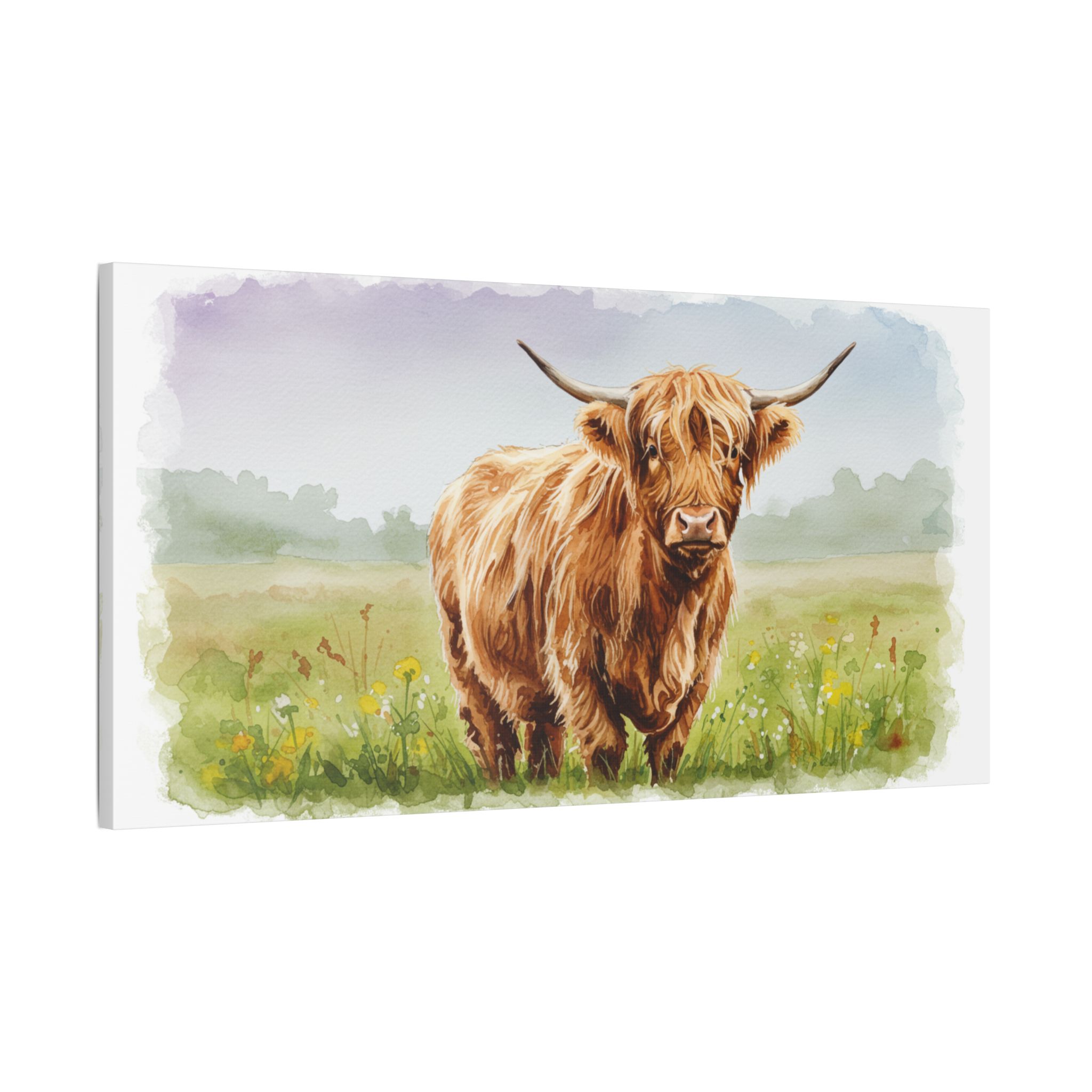 Each canvas is meticulously crafted from 100% polyester and pre-stretched over a solid wooden inner frame for both durability and elegance. The satin finish enhances every detail, allowing the rich, earthy tones of the highland cow to shine with depth and vibrancy.