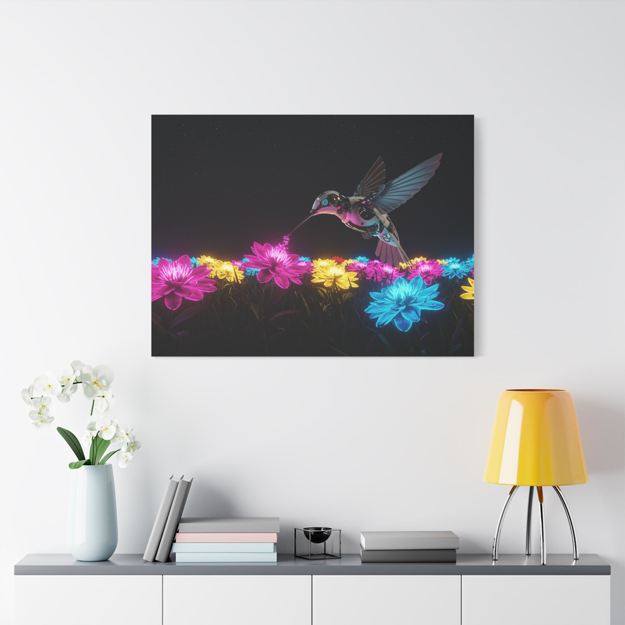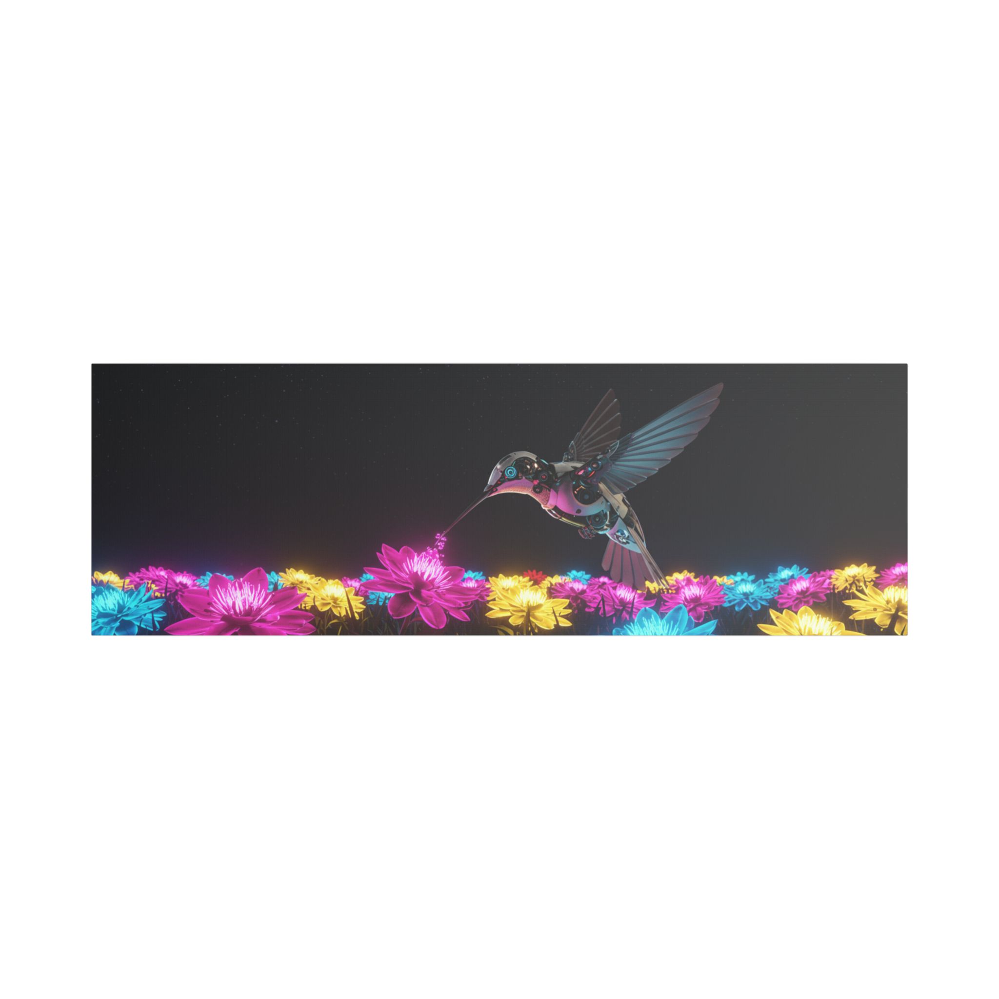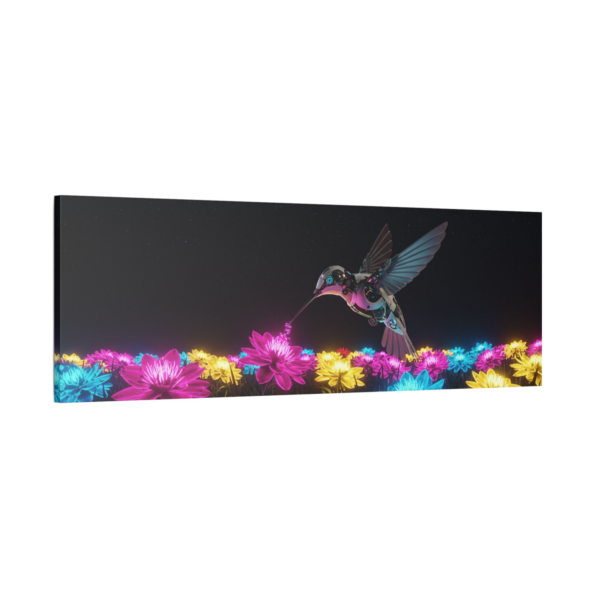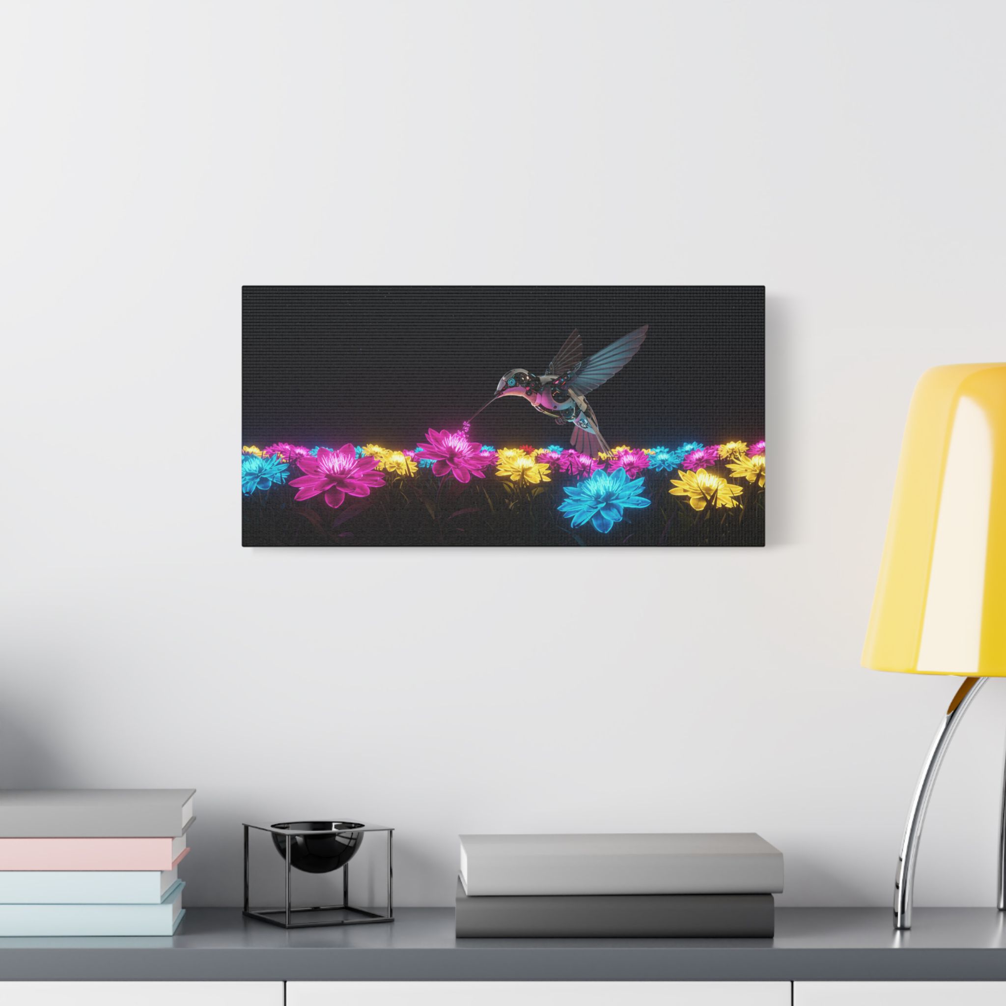 Designed for those who appreciate both artistry and elegance, this exclusive piece blends contemporary neon brilliance with the delicate grace of nature. The high-definition print on premium canvas ensures vivid colors that shine as brightly as the hummingbird itself, making it a striking centerpiece for any room.