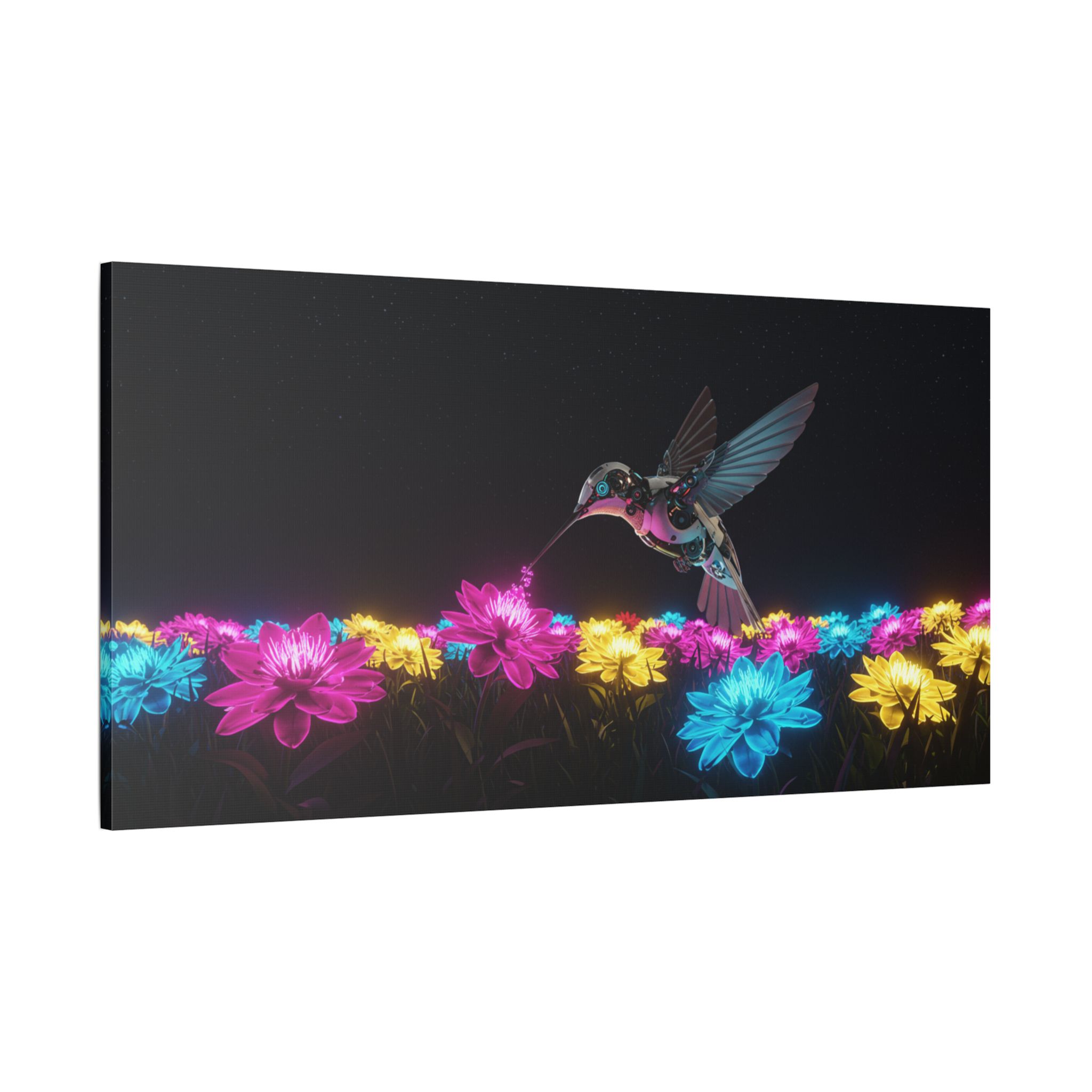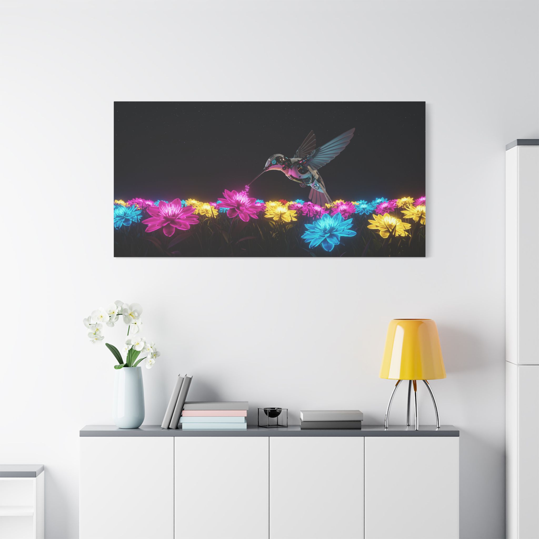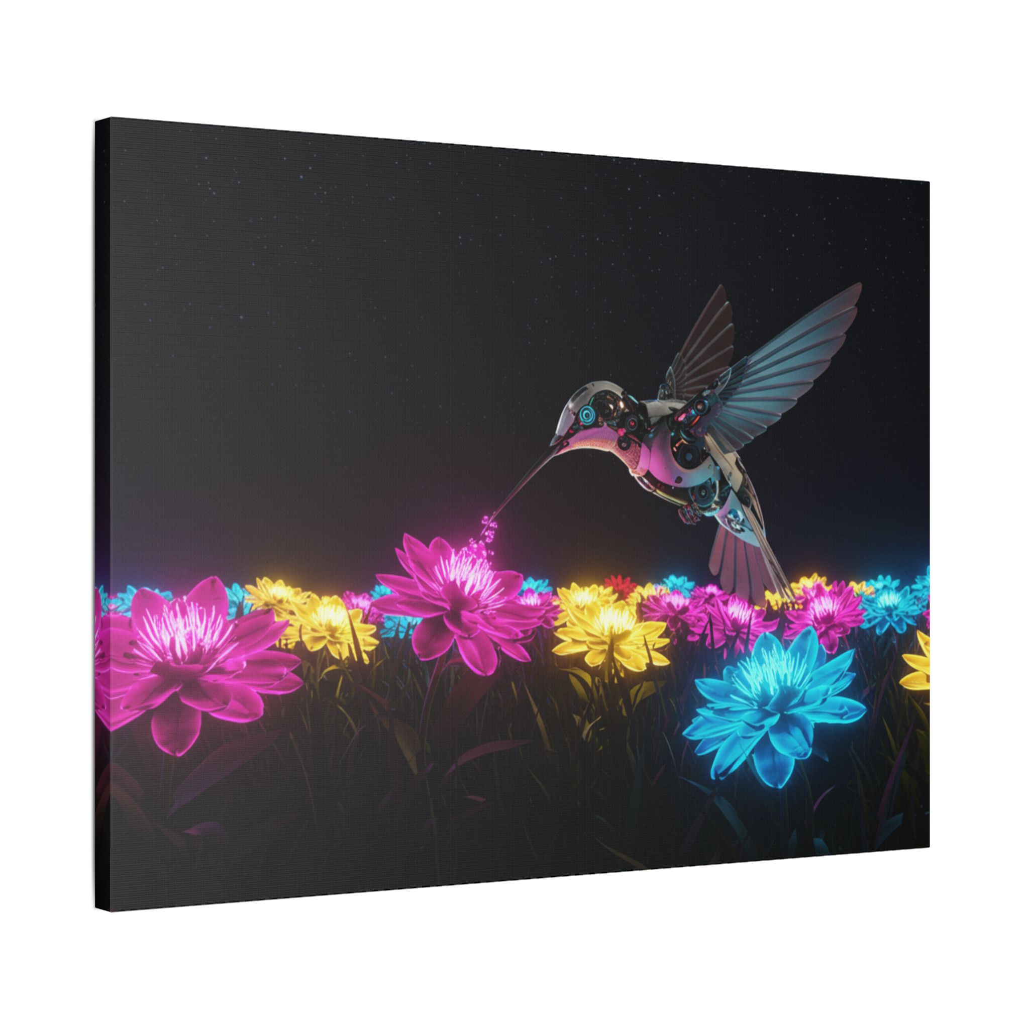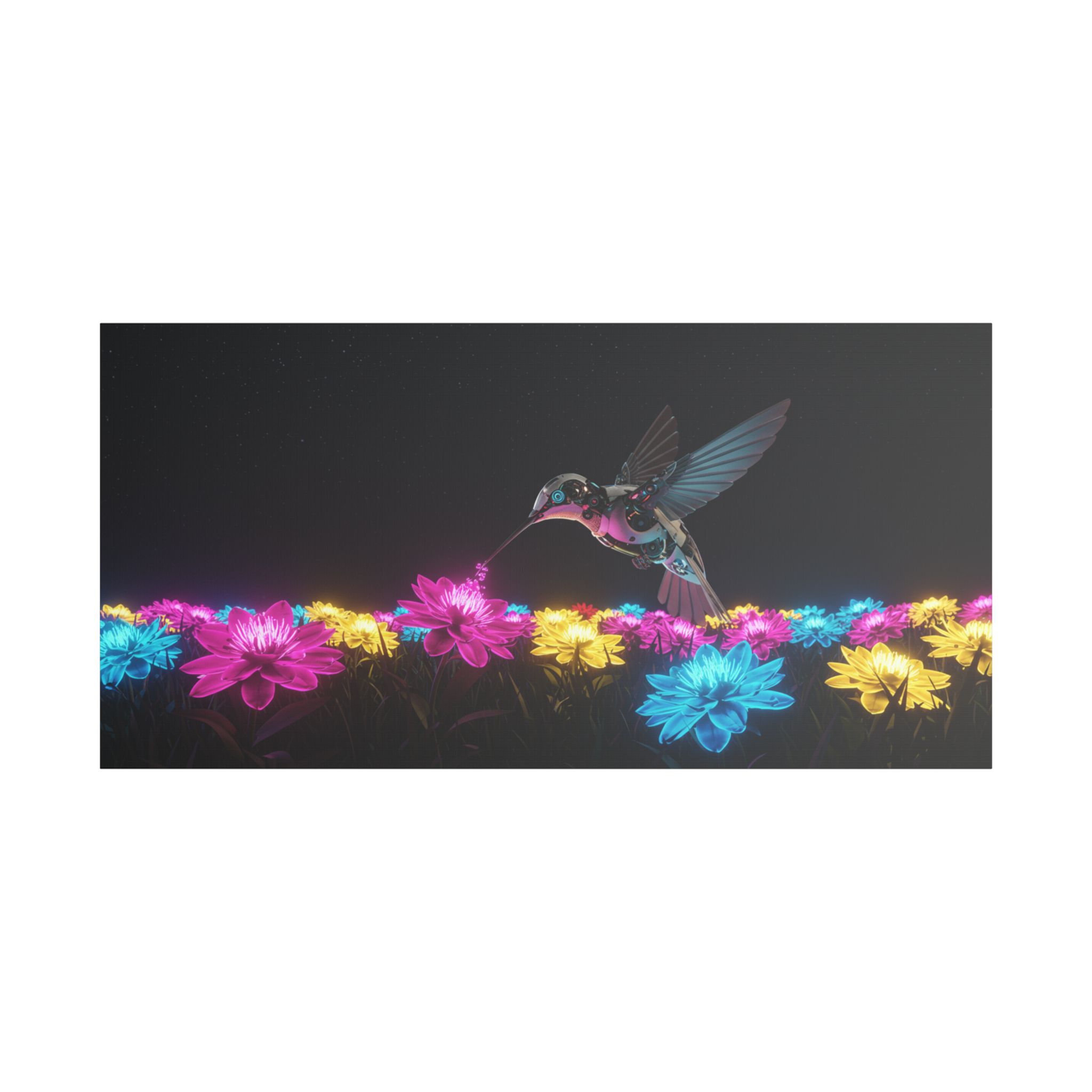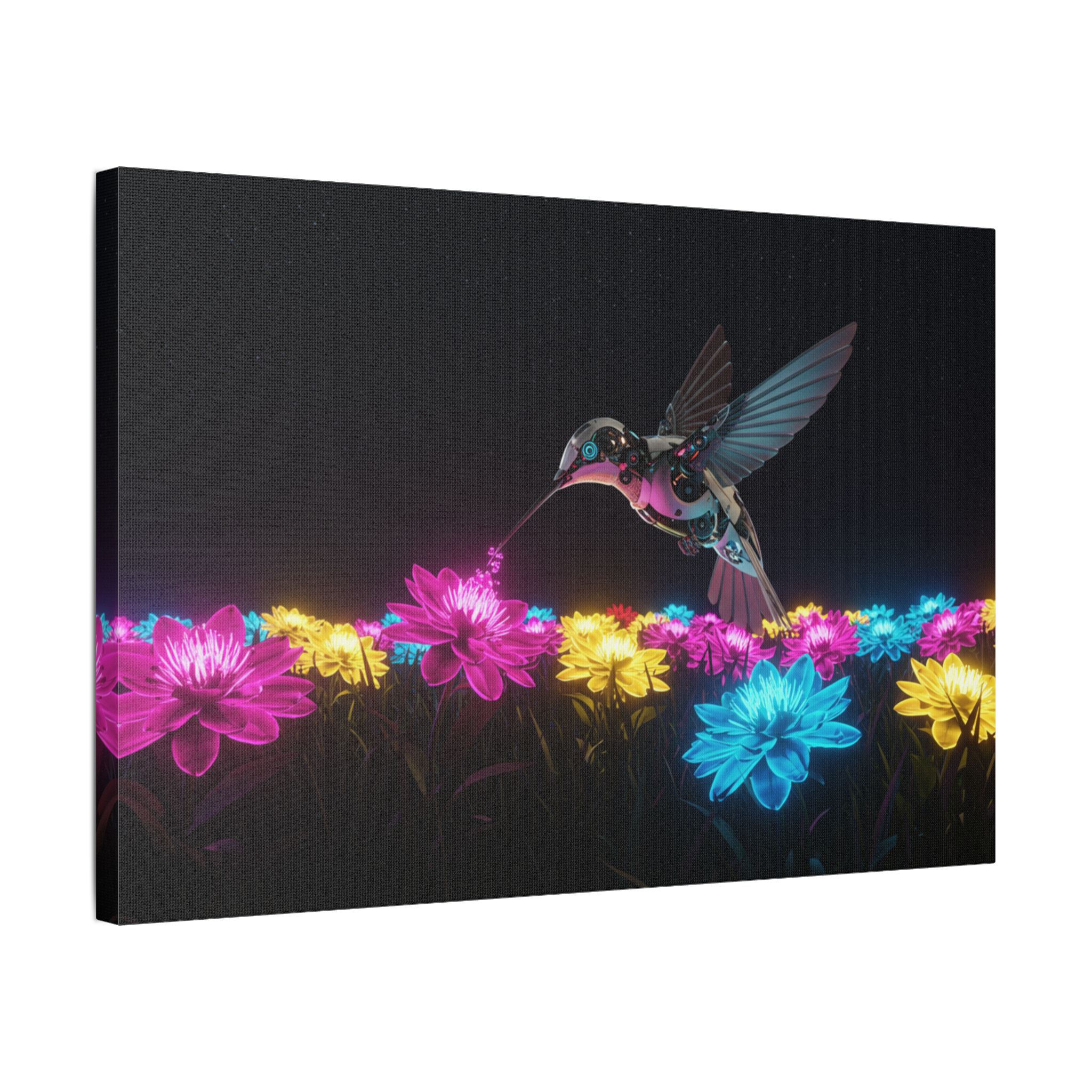 Designed for those who appreciate both artistry and elegance, this exclusive piece blends contemporary neon brilliance with the delicate grace of nature. The high-definition print on premium canvas ensures vivid colors that shine as brightly as the hummingbird itself, making it a striking centerpiece for any room.