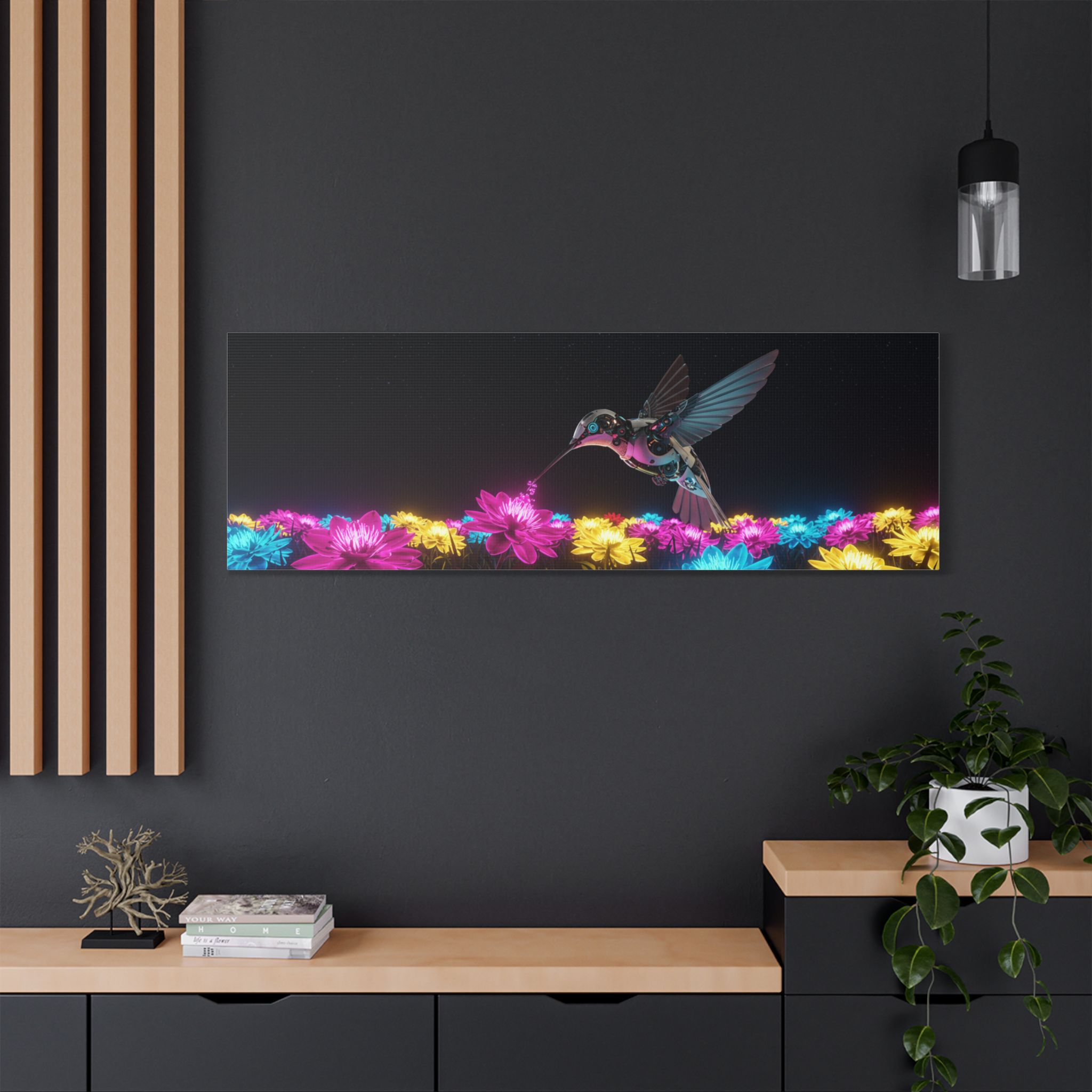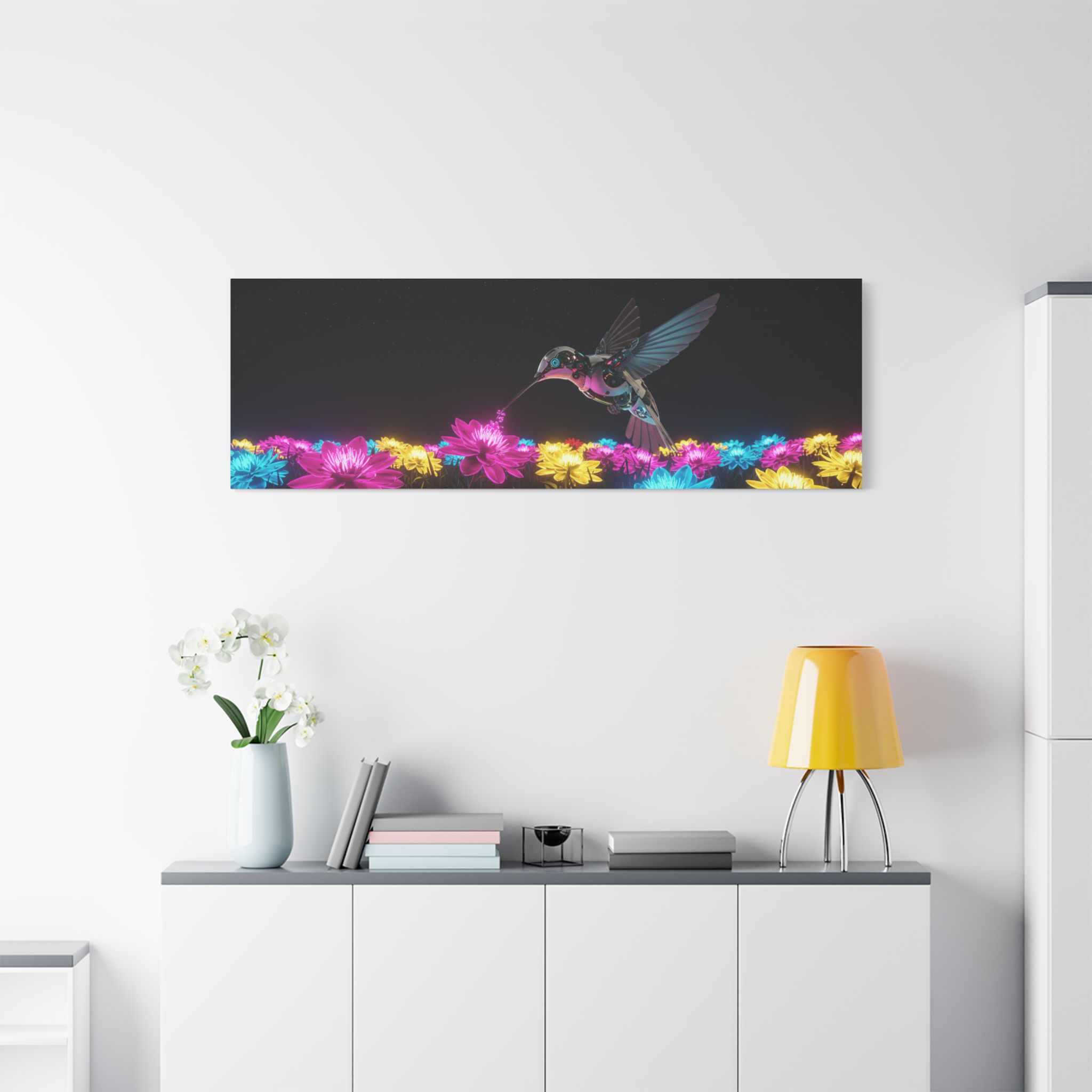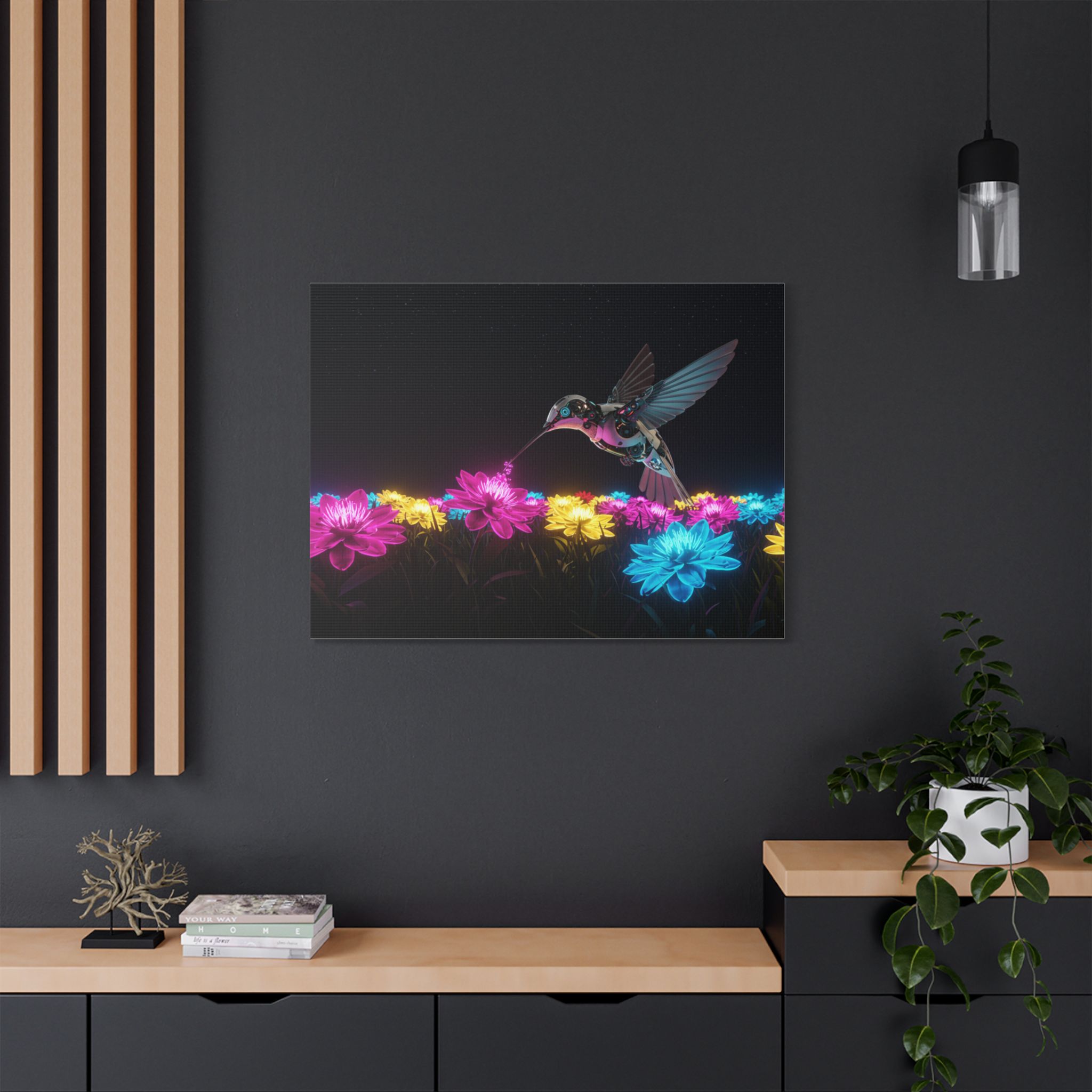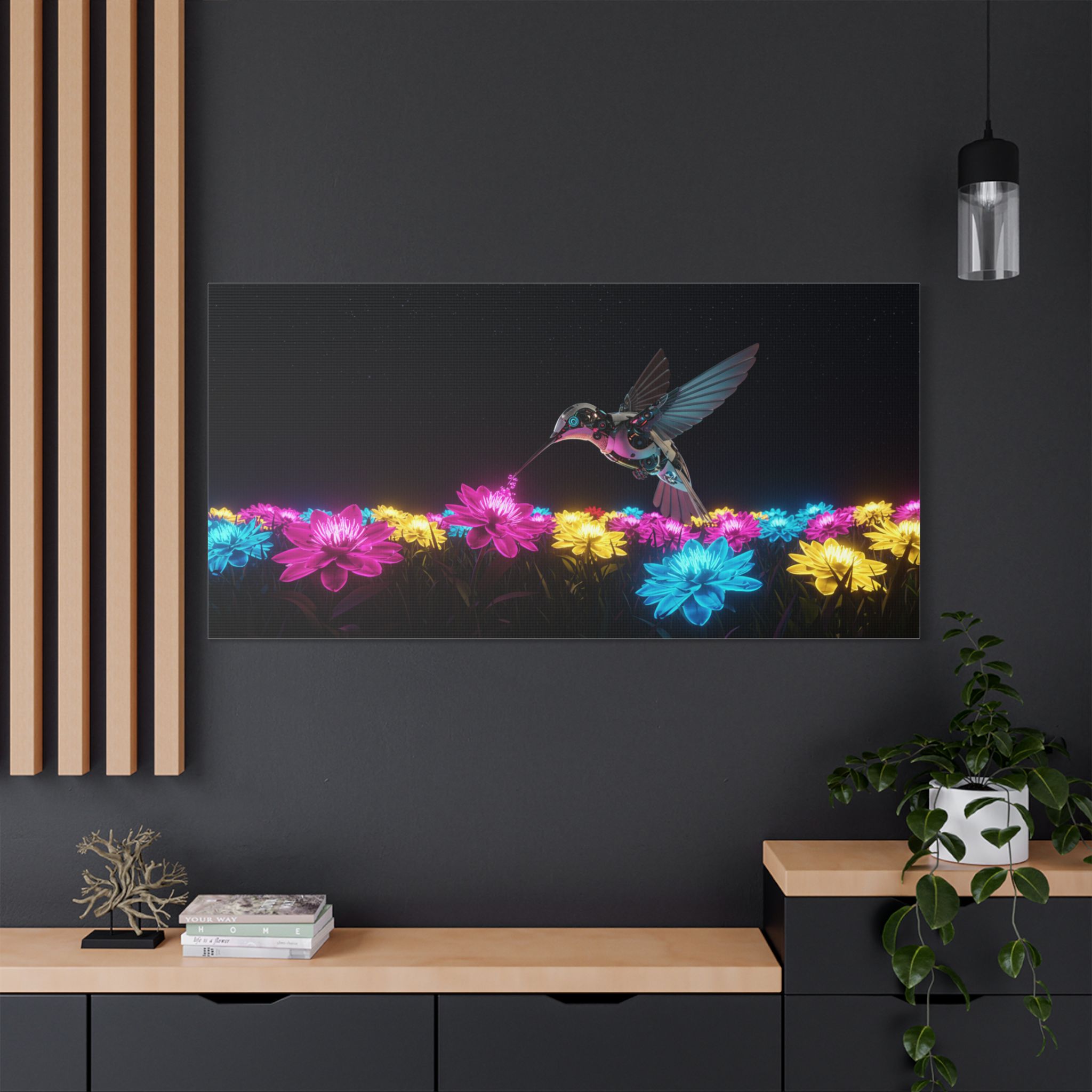 Designed for those who appreciate both artistry and elegance, this exclusive piece blends contemporary neon brilliance with the delicate grace of nature. The high-definition print on premium canvas ensures vivid colors that shine as brightly as the hummingbird itself, making it a striking centerpiece for any room.